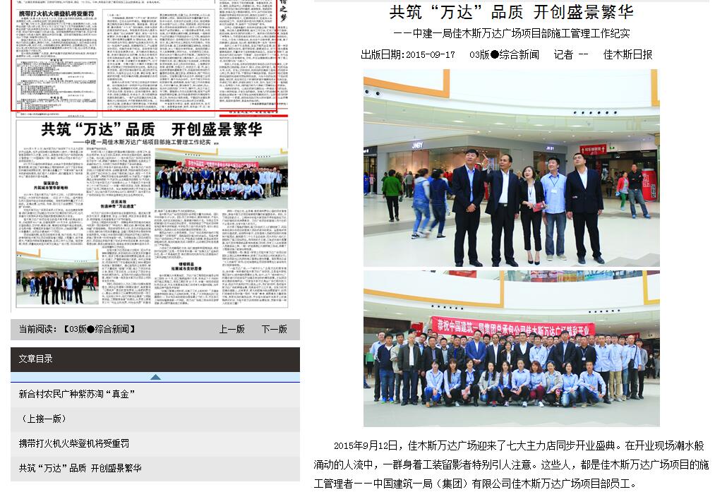 佳木斯万达广场项目部施工管理工作纪实》一文,对总承包公司佳木斯万达项目进行了报道。链接地址及内容如下://newspaper.dbw.cn/jmsrb/20150917/5120.html